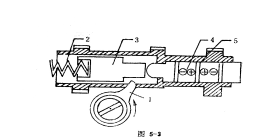 點(diǎn)火器種類繁多,現(xiàn)以家用壓電點(diǎn)火器為例說明它的結(jié)構(gòu)和工作原理。如圖5-3所示的點(diǎn)火器,可固定在家用灶具上點(diǎn)燃煤氣,轉(zhuǎn)動(dòng)凸輪開關(guān)1,利用凸輪凸出部分推動(dòng)沖擊塊3,并壓縮沖擊塊后的彈簧2。當(dāng)凸輪凸出部分脫離沖擊塊后。由于彈簧彈力作用,沖擊塊給陶瓷壓電元件4一個(gè)沖擊力,便在壓電元件兩端產(chǎn)生高壓,并從中間電極5輸出高壓,產(chǎn)生電火花點(diǎn)燃?xì)怏w。